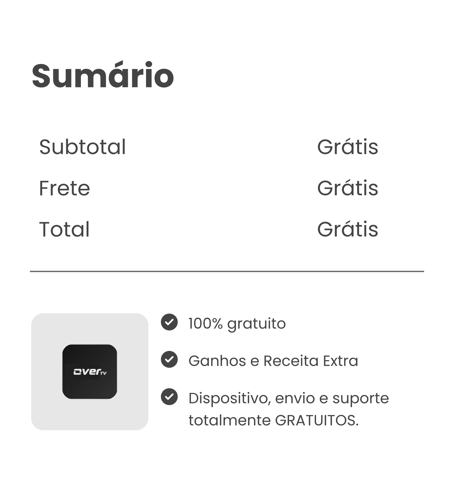 Não há custos ocultos nem contratos de fidelidade. Se por algum motivo o OverTV não atender às suas expectativas, você pode devolver o dispositivo sem qualquer penalidade.
